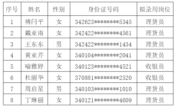 根据公司经营发展需要,合家福公司于2025年2月针对各岗位人员需求组织实施招聘工作,经过报名、简历筛选、面试等程序,确定傅闩平、戴亚南等八名同志为拟录用人员,现将拟录用人员予以公示: